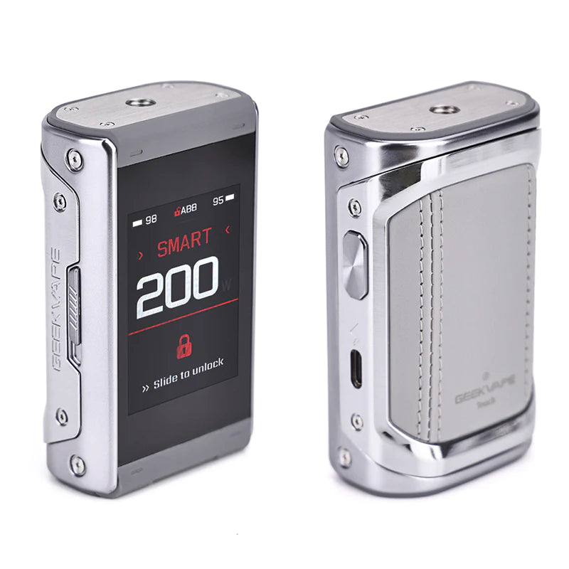 Geekvape T200 Box mod is powered by dual 18650 batteries with max 200W output & Type-C charging, supporting POWER/ TC-SS/ TC-TCR (VPC, SMART, BYPASS) modes. Geekvape T200 (Aegis Touch) features a 2.4-inch Full Touch Screen with 4 dynamic UI themes.