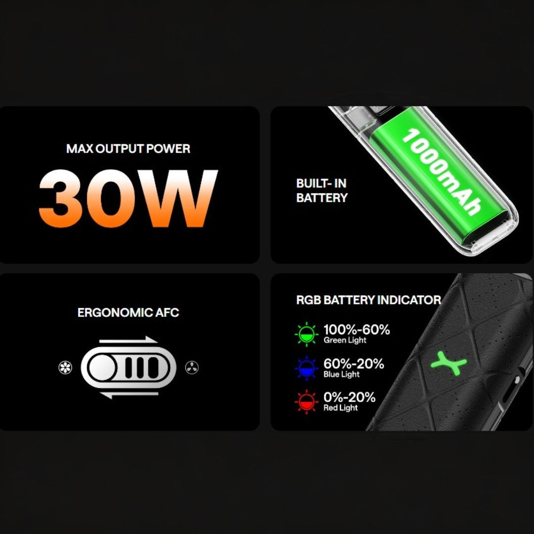 Introducing the OXVA Xlim Go Kit, a compact device with a 2ml capacity, 1000mAh built in battery, and a maximum output of 30W. Designed for mobility, it has a pen style design and is made of faux leather and PC. With a side airflow control system catering to both MTL and RDL vaping, and magnetic pods accommodating a wide resistance range, it's perfect for both freebase e-liquids and nic salts.