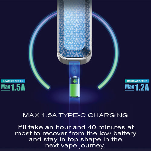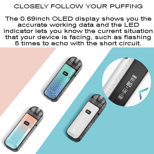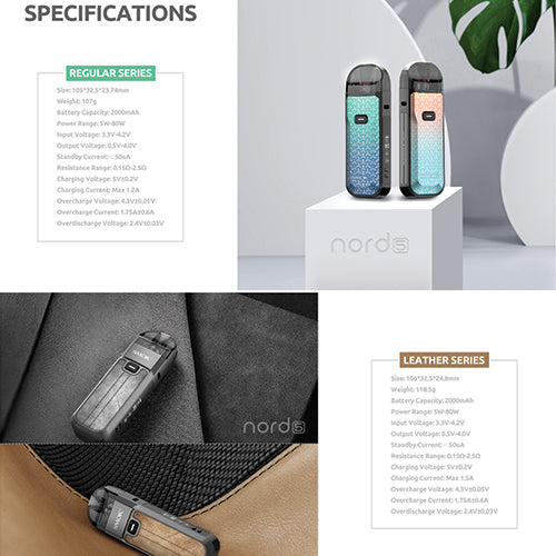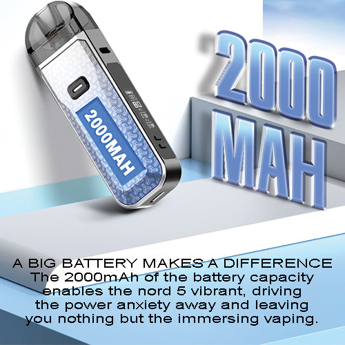 There are 12 color options for SMOK Nord 5, of which 8 are Regular Series and 4 are Leather Series. The Nord 5 comes with a 2000mAh built-in battery, which is large enough for a whole day of vaping. Besides, a 0.69inch OLED display screen is equipped on the side of Nord 5, showing you the accurate working data.