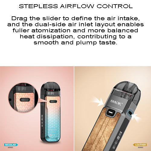 On the opposite side of the power button is the step-less airflow control button. It uses the sliding bar design, which is the easiest and simplest way for a user to control airflow. Drag the slider to define the air intake, and the dual-side air inlet layout enables fuller atomization and more balanced heat dissipation, contributing to a smooth and plump taste.