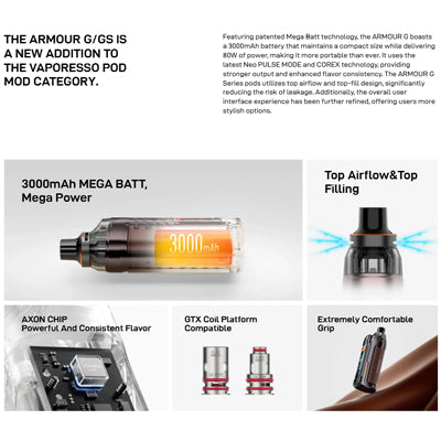 The Armour G comes equipped with a powerful, built-in 3000mAh battery that keeps you vaping longer without the hassle of swapping batteries. With adjustable power from 5 to 80W, you stay in full control, dialling in the perfect intensity for your vapour. Included in the box are two high-performance GTX coils and an Armour G Series pod, so you can dive right in with your favourite e-liquid.