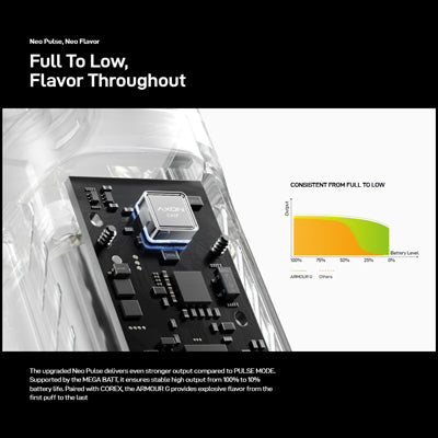 Setting up yourĀ VaporessoĀ Armour G is a breeze. Simply click the pod into place and let Smart Mode take care of choosing the perfect settings for your coil. If you want to spice things up, switch to Pulse Mode for enhanced flavour or tweak the wattage for a personalised experience. When your battery's running low, Eco Mode is there to stretch every drop of power, and the bright 0.96ā TFT screen ensures you always know where you're at.