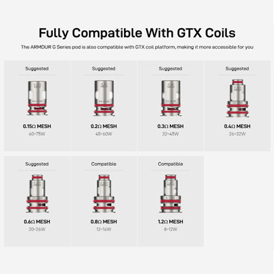 The Armour G Series pods hold up to 2ml of your favourite e-liquid and are compatible with replaceableĀ GTX coils. Swapping coils is a snap, keeping your vape fresh and flavorful. With the included 0.2 Ohm and 0.4 Ohm GTX mesh coils, you can count on bold flavour and consistent performance across a variety of wattages.