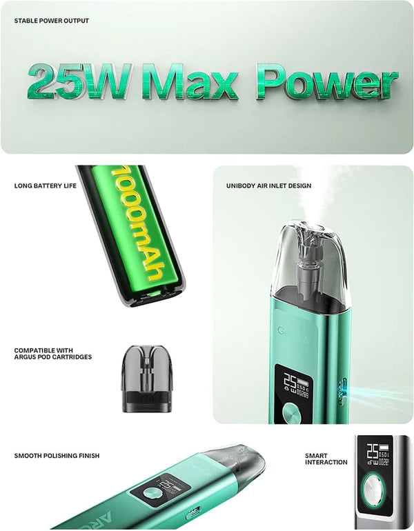 ARGUS G is VOOPOO's first “rectangular stick style” POD designed to give vapers an all-around smooth experience. The nanometer-scale polishing processes and aluminum alloy integrated streamline design make ARGUS G shine with luster and feel smooth. The built-in 1000mAh battery easily covers about 3 days of vaping needs. Adopting VOOPOO ITO specialized atomization technology for MTL vaping, ARGUS G delivers a stable taste with a 5W-25W wattage setting and prolongs the lifespan of coil. ARGUS G is suitable for FREE BASE and nicotine salt e-liquid and one coil (or one preinstalled coil) supports the full taste of about 14ml of e-liquid (7 tanks of oil). Besides, a multi-function button with a OLED screen, the adjustable power and airflow function, recording puff counts and manual lock/unlock bring vapers a more personalized experience.